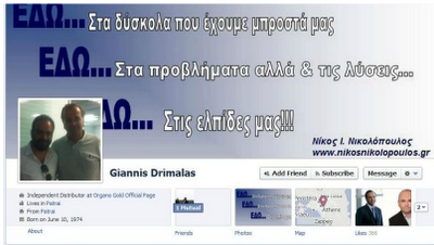 “Ο Κύριος Giannis Drimalas πολιτευτής της ΟΝΝΕΔ & της ΝΔ ο οποίος μου έστειλε αίτημα φιλίας, με αφορμή ανάρτηση στον τοίχο του όπου έγραψε αυτολεξί τα λόγια του Αντώνη Σαμαρά στην πολιτική διαφήμιση της ΝΔ όπου και καταλήγει «ΜΑΖΙ ΘΑ ΤΑ ΚΑΤΑΦΕΡΟΥΜΕ» και του απάντησα «Πάλι σήμερα είχαμε 3 αυτοκτονίες Γιάννη.